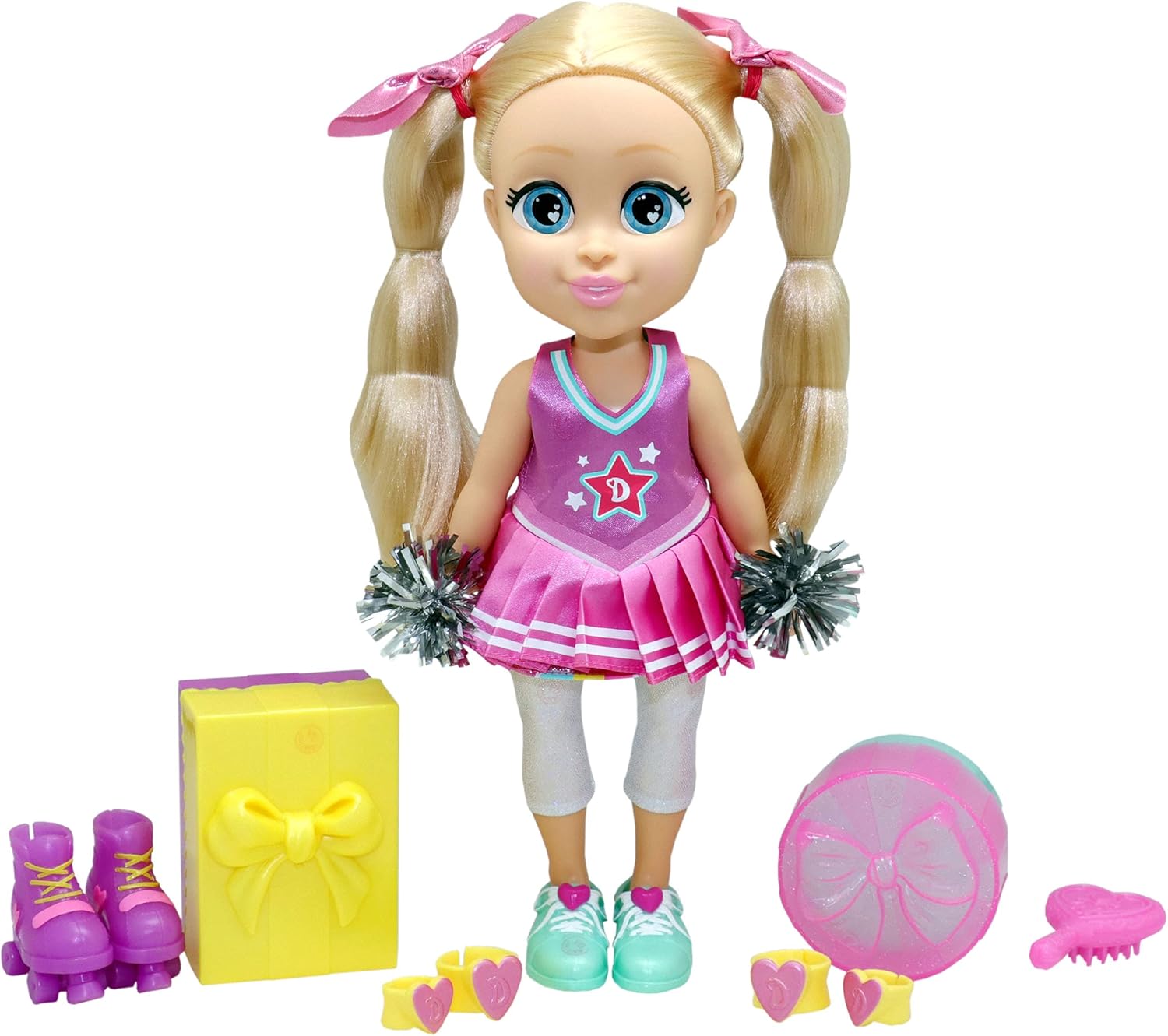 - Two outfits in one! Cheerleader & Roller Skater! ,Includes 13” Diana doll,Accessories for Diana include: Sparkly Pom Poms, Cute Roller Skates, Elbow Pads & Knee Pads, Reversible Dress, Hairbrush,Accessories for you include: colorful bracelet.