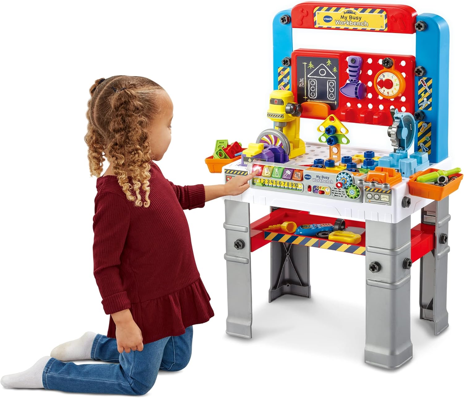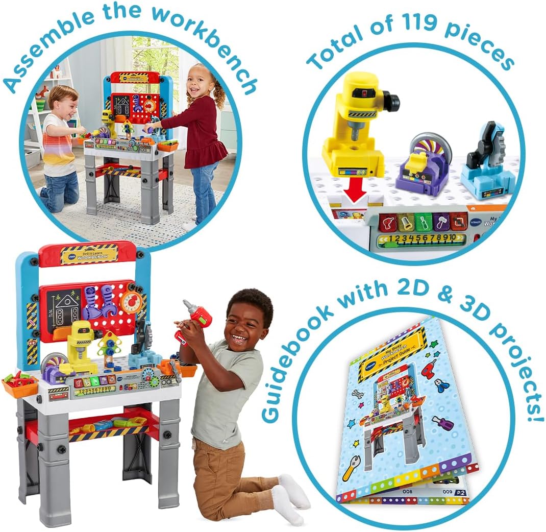 - MULTIPLE PLAY MODES: The workbench offers 3 modes of play - Free play, Quiz mode, and Music mode - providing versatility and catering to different play preferences. Additionally, the included play piece storage tray ensures convenient organization and easy access to all the tools and play pieces. For Kids Age 2, 3, 4 + Years